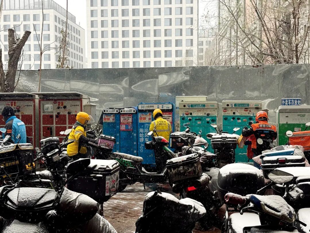 12月12日,下雪的北京,丰台区丰科万达商圈附近电动车停车场、换电站出现拥堵,骑手忙碌地取、送订单,或者边休整边等待订单。 摄影/本刊记者 王诗涵