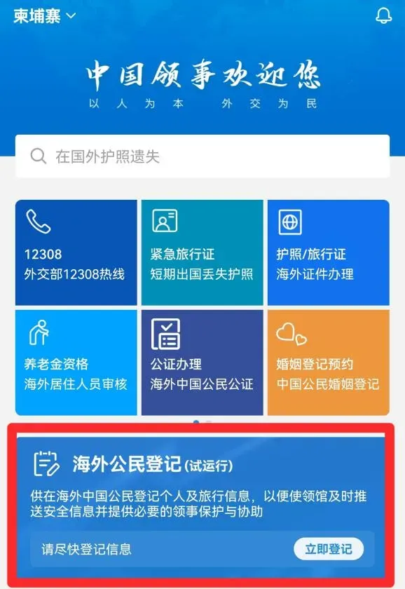 为充分发挥信息化手段优势,帮助中国公民更好获得领事保护与服务,请在柬中国公民积极下载“中国领事”APP或通过“中国领事”微信小程序参与“海外公民登记”。请确保所填个人信息真实、准确、完整,享拍交流群所填信息将受到严格保护。驻柬使馆将根据信息登记情况,有针对性地推送安全信息,为在柬中国公民提供及时、有效的领事保护与协助。